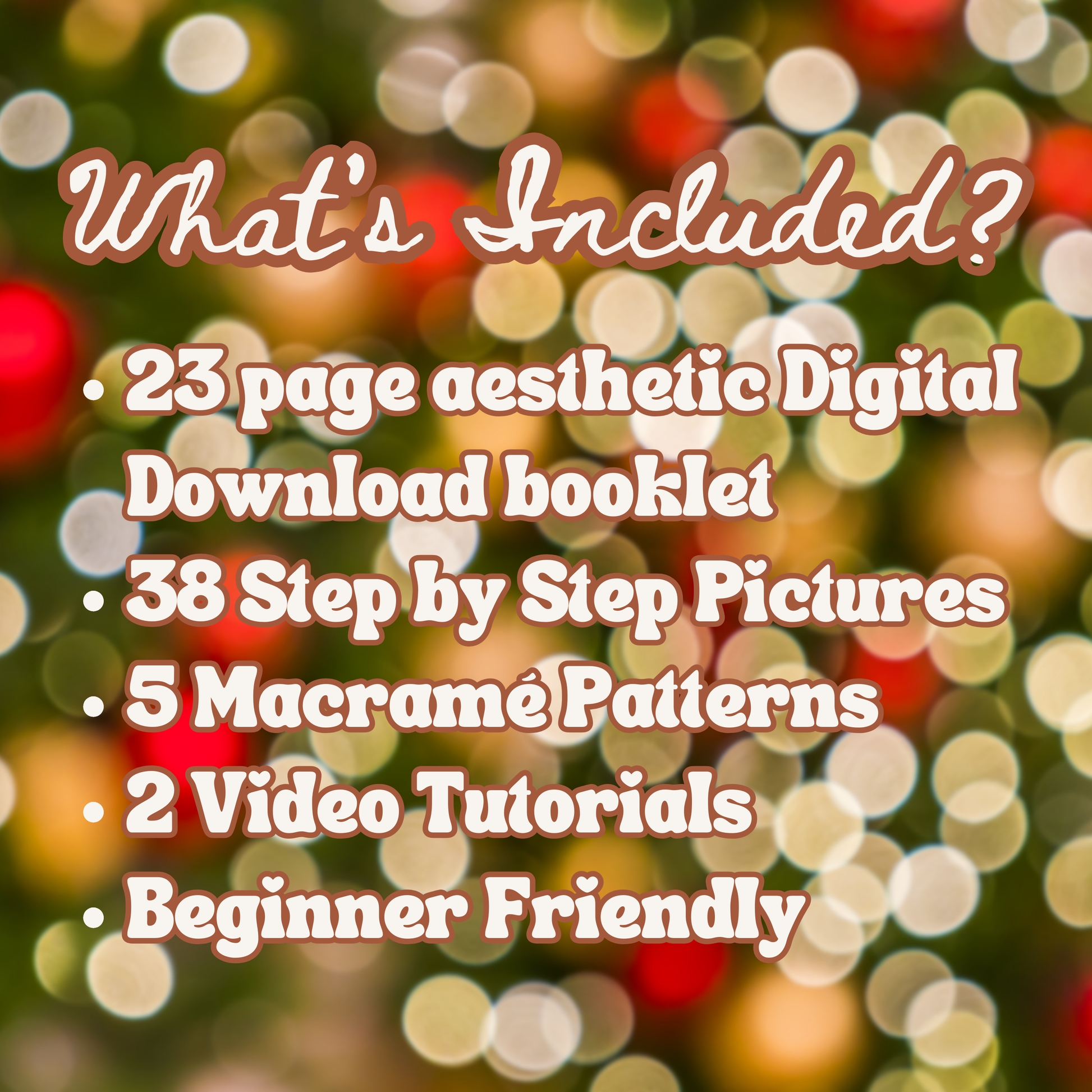 - links to 3 video tutorials, with exact time stamps to assist with every step of the pattern: i.e. how to set up your project, create each knot, etc.